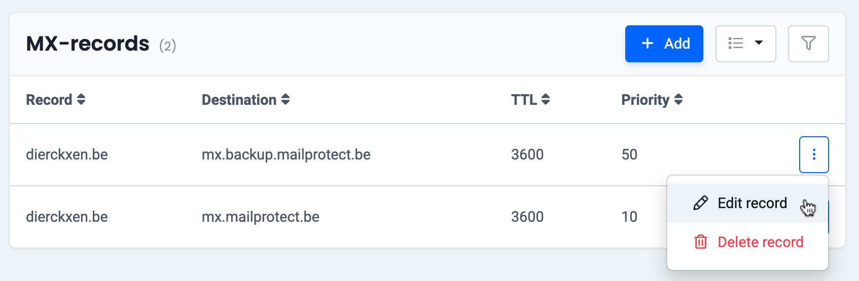 - To change an existing MX-record, choose the host that you want to change and click on the three dots to the right and then on “Edit record”. Enter the new IP address and click on “Change MX record”.