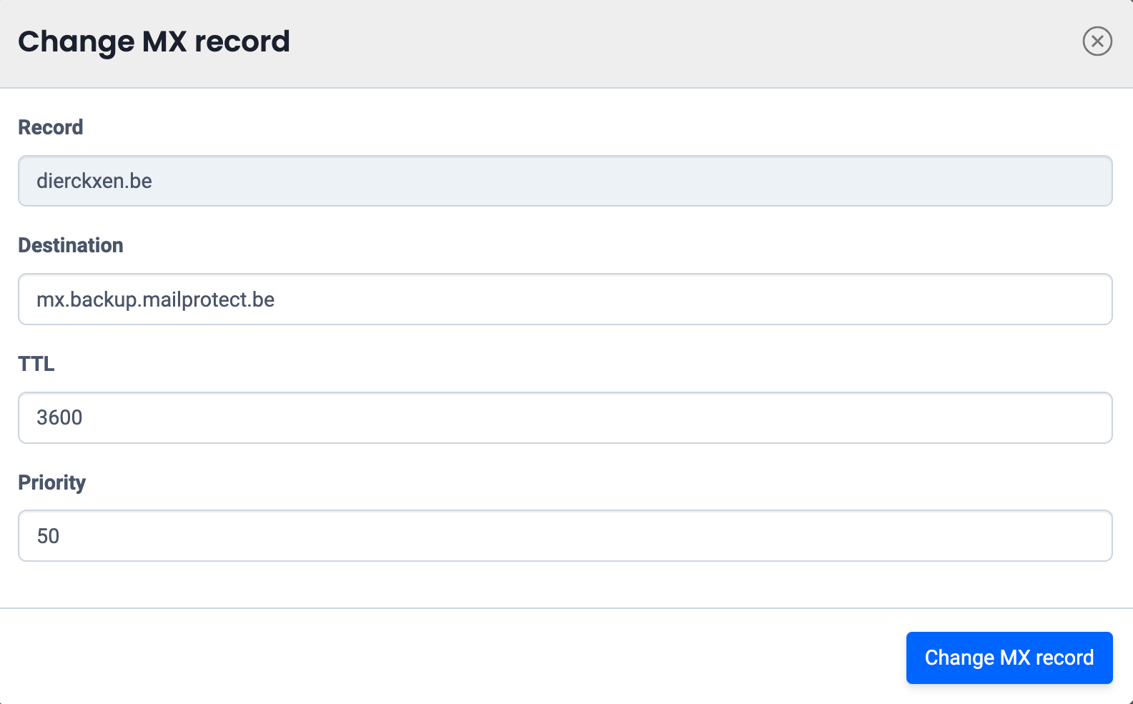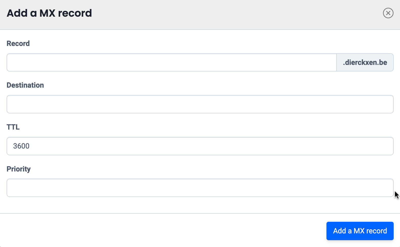 You can add a new MX-record by clicking on “+ Add” at the top. The left text field leaves you blank unless you want to set the e-mail traffic of a subdomain (advanced). Enter the destination, Time To Live (TTL) and priority as desired and click on “Add MX record”. - The changes are activated. Remember that this can take 1 to 4 hours. You can check the active records via: http://who.is/dns/
