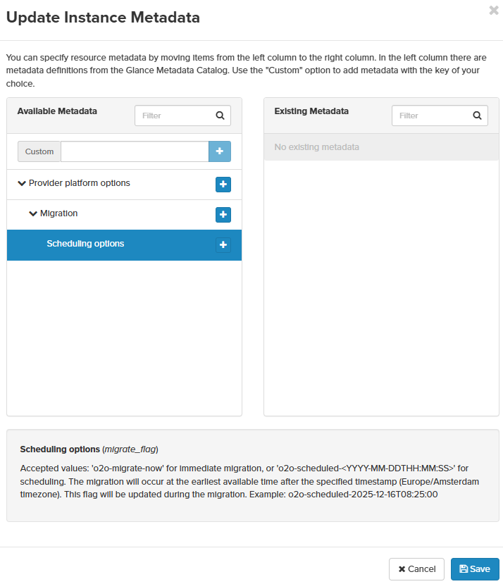 Wanneer je instance gemarkeerd is voor migratie, wordt er extra metadata toegevoegd aan je instance met de naam o2o-scheduled-YYYY-MM-DDTHH:MM:SS. Je kunt de migratie inplannen door de datum/tijd aan te passen (tijden zijn in de Europe/Amsterdam-tijdzone!) naar jouw voorkeur. Een datum/tijd in het verleden zal de migratie zo snel mogelijk starten zodra er een migratieslot beschikbaar is (normaal binnen een minuut). Als alternatief kun je de metadata o2o-migrate-now instellen op de metadatakey migrate_flag.